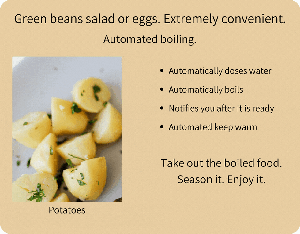 Chicken, steak, fish or shrimps -simply load your perishable food into OTTONOM and go back to whatever you want to do with your time. It will automatically dispense water into the cooking pot, defrost, precision cook the food and notify you when it is ready .