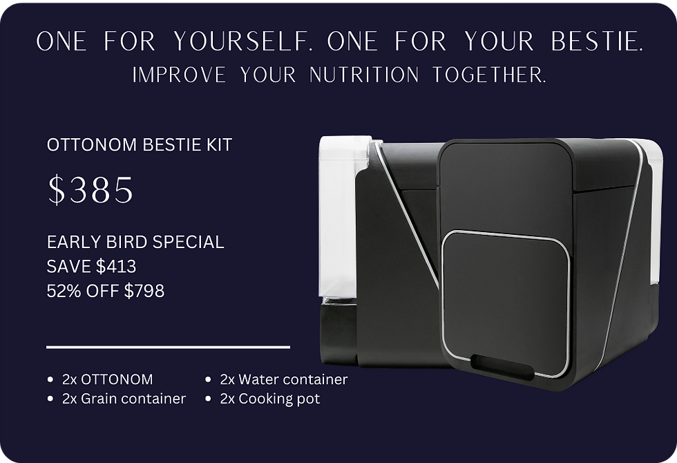 OTTONOM has a novel smart grain dispenser. All you need to do is refill it with raw grains once a week. As and when you need, it will automatically dispense the portion size you want, based on your dietary needs! It also has a smart cooker that can automatically cook grains, sous-vide, defrost and boil. With our app, you have smart assistant features including scheduling your meals ahead, set your calorie goals, tracking your macros and guided recipes.